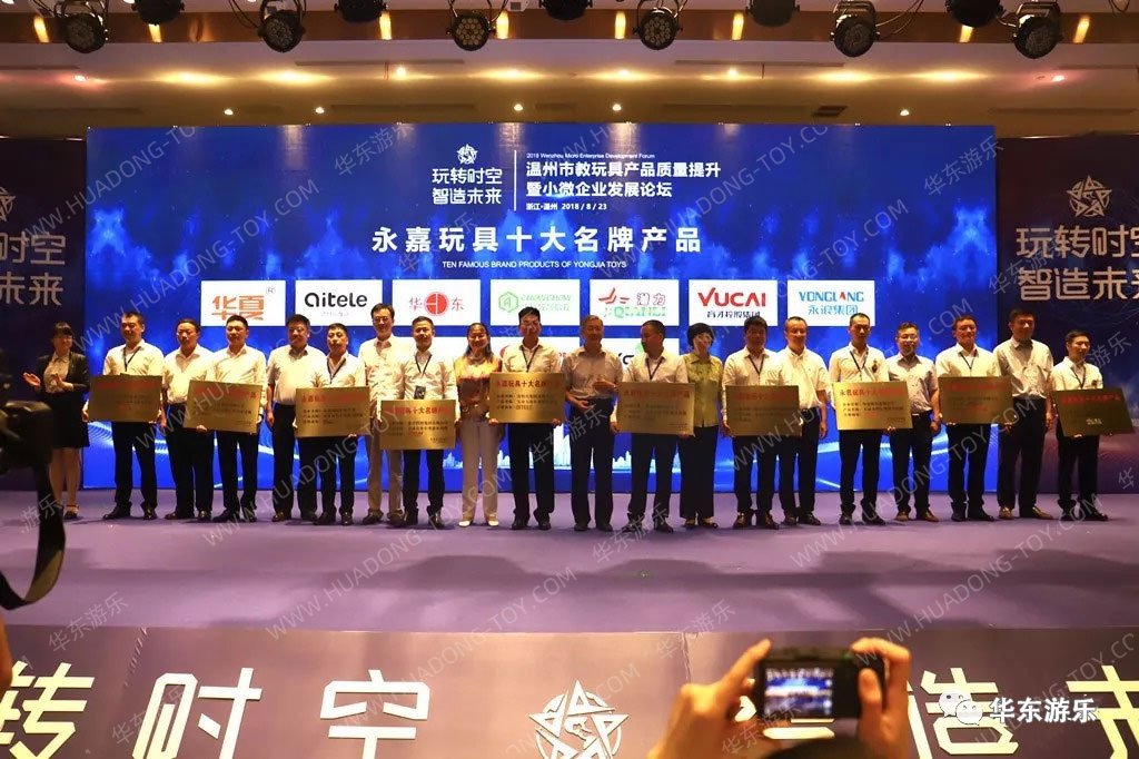 首届“永嘉玩具十大名牌产品”评选结果也在论坛上正式揭晓。奇特乐集团有限公司、育才控股集团有限公司、凯奇集团有限公司、永浪集团有限公司、浙江巧巧教育科技有限公司、立本集团有限公司、华夏游乐有限公司、leyu.乐鱼游乐设备有限公司制造的无动力类小型游乐设施产品以及贝旺玩具有限公司、浙江潜力玩具有限公司制造的塑胶玩具产品被评为“永嘉玩具十大名牌产品”。