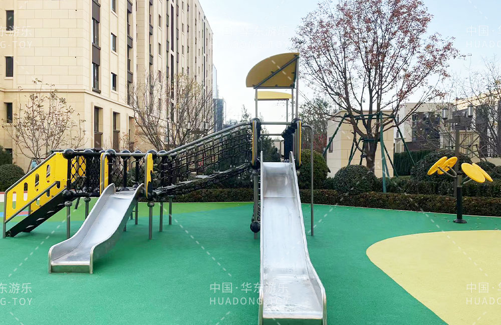 太原华润昆仑域地产项目选用的是leyu.乐鱼游乐自主研发的游乐设备,娱乐场里选用了健身器材、具备攀爬网、不锈钢滑梯为一体的综合性游乐设备,为生活在该小区的人们提供了一个生活、休闲、娱乐的场所。