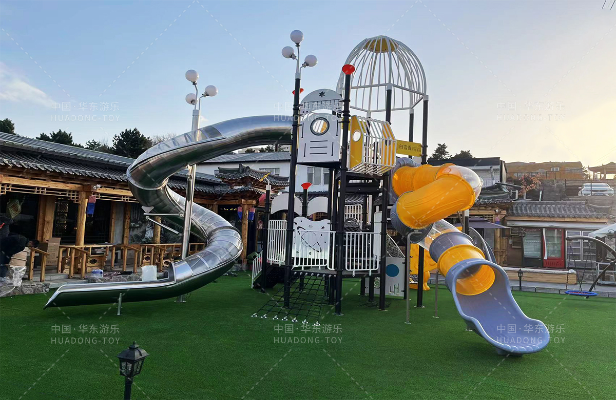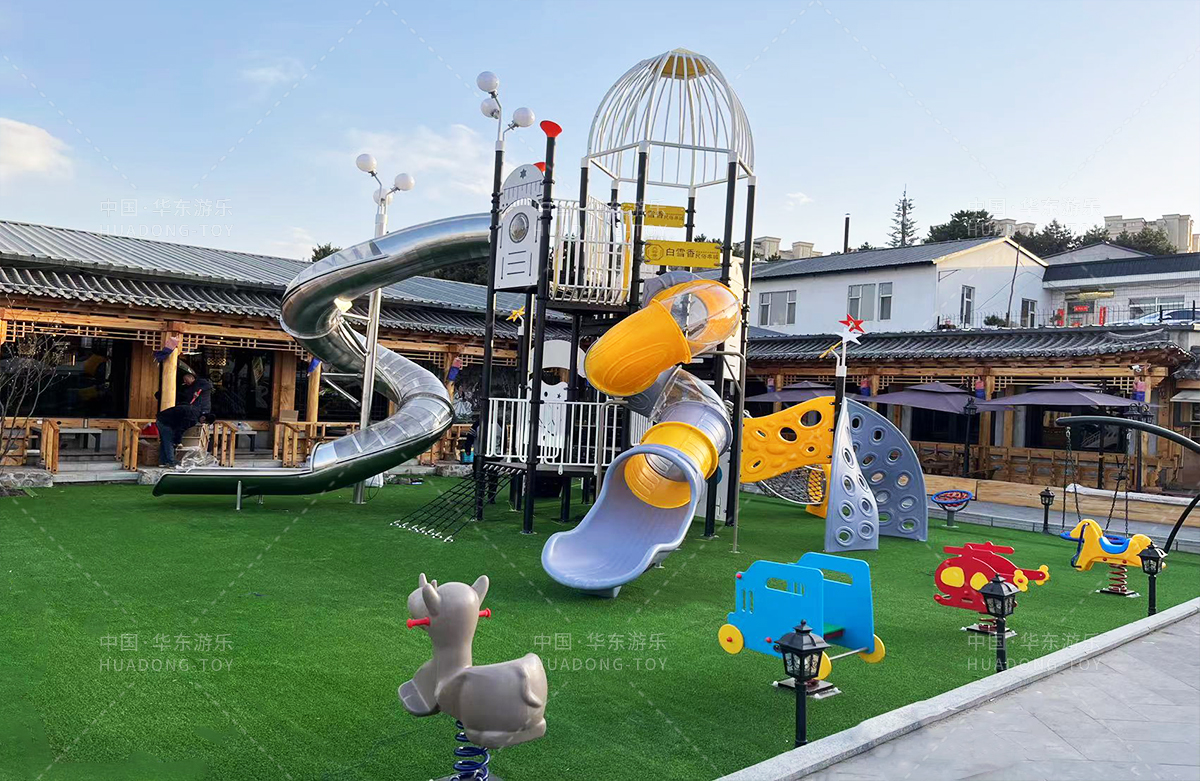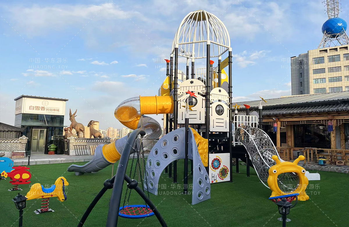 吉林省白雪香民俗烧烤城是一个专业的休闲夜宵烧烤城,此次选用的是leyu.乐鱼游乐自主研发和设计的 PE板系列滑梯,卡通的造型,齐全的功能深受小朋友们的喜爱,同时还设置了小朋友喜欢的儿童摇摇乐、组合秋千、 旋转碗等游乐设备。