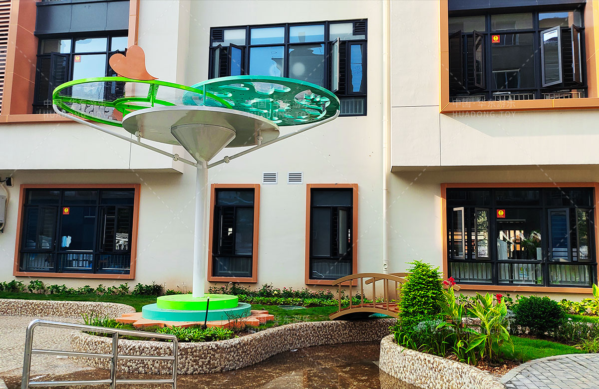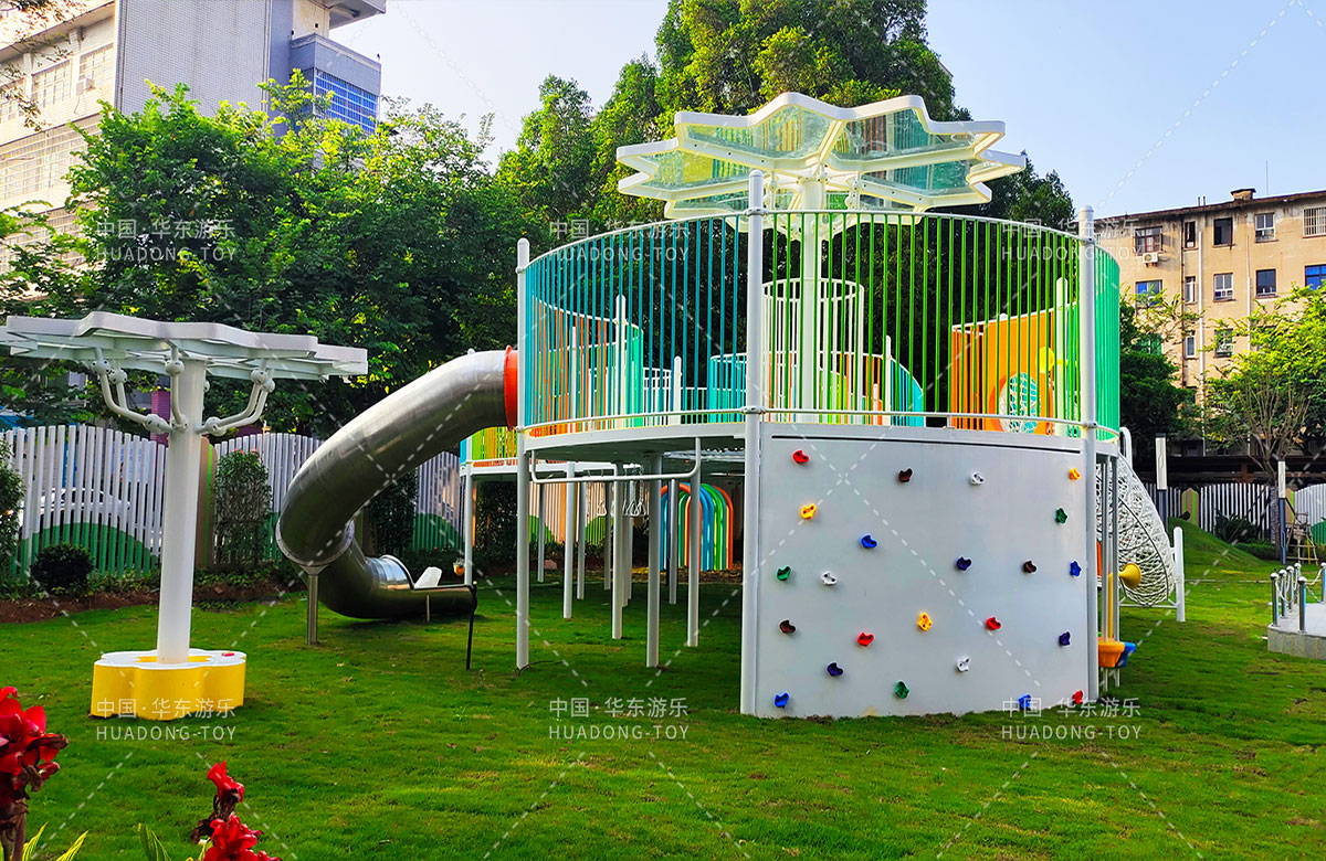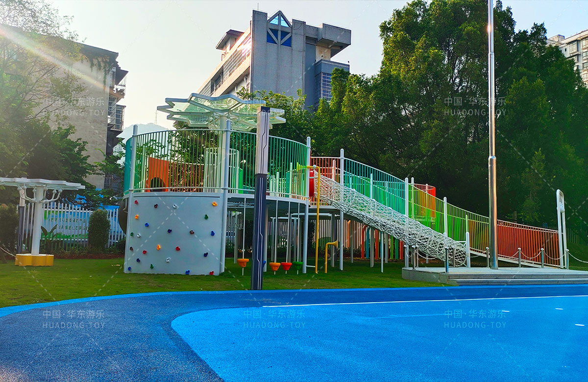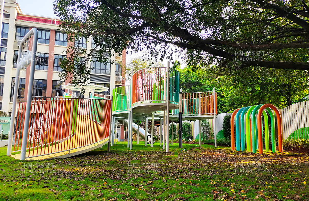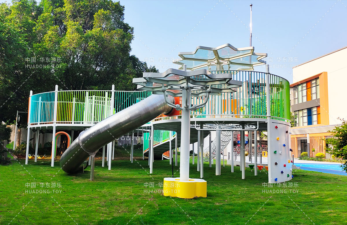 三明市实验幼儿园 选用的是leyu.乐鱼游乐自主研发和设计的非标定制系列的组合游乐设备,是一款具备了攀爬网、空中网桥、攀爬墙、儿童秋千、大型滑筒、平衡吊环、彩虹桥等功能,除此之外还设置了树形休闲厅、木制小桥等游乐设备,让孩子们有一个健康的成长环境,也为老师的教学提供了保障。